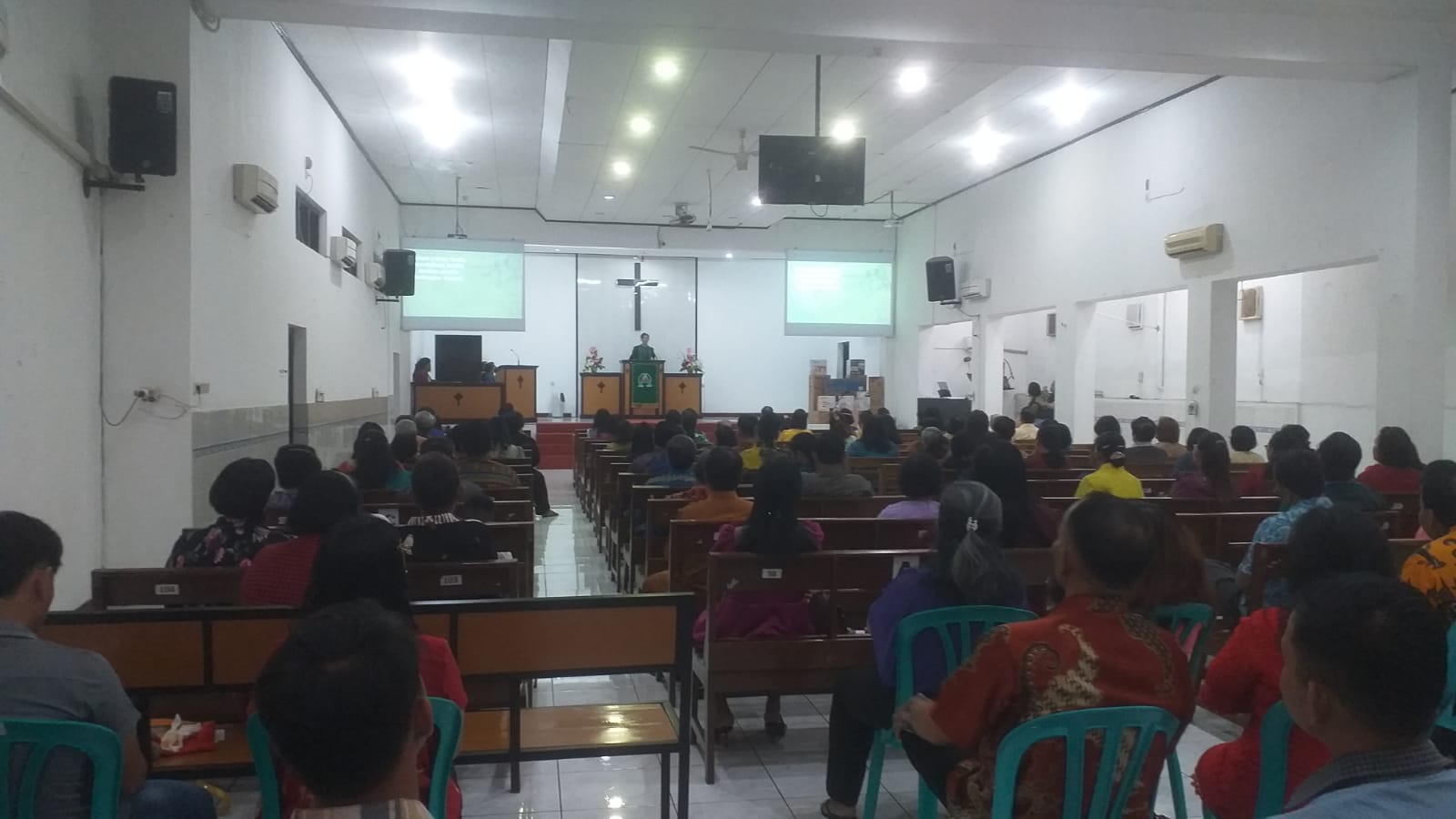 Pendeta Tio Bastian memimpin 60 jemaat untuk peribadatan dengan tema "Keluarga Yang Diundang Untuk Bersukacita".